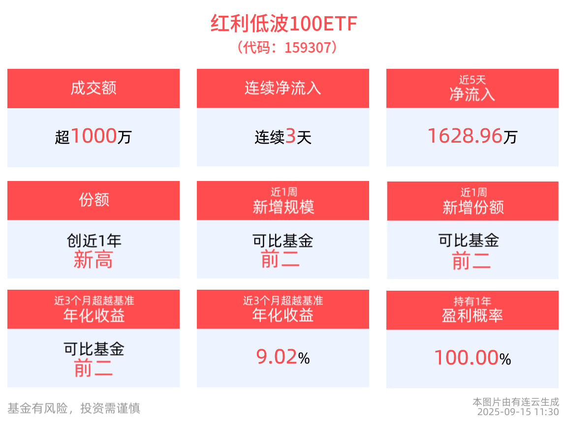 流动性方面,红利低波100ETF盘中换手1.03%,成交1331.94万元。拉长时间看,截至9月12日,红利低波100ETF近1月日均成交1790.47万元,居可比基金前2。