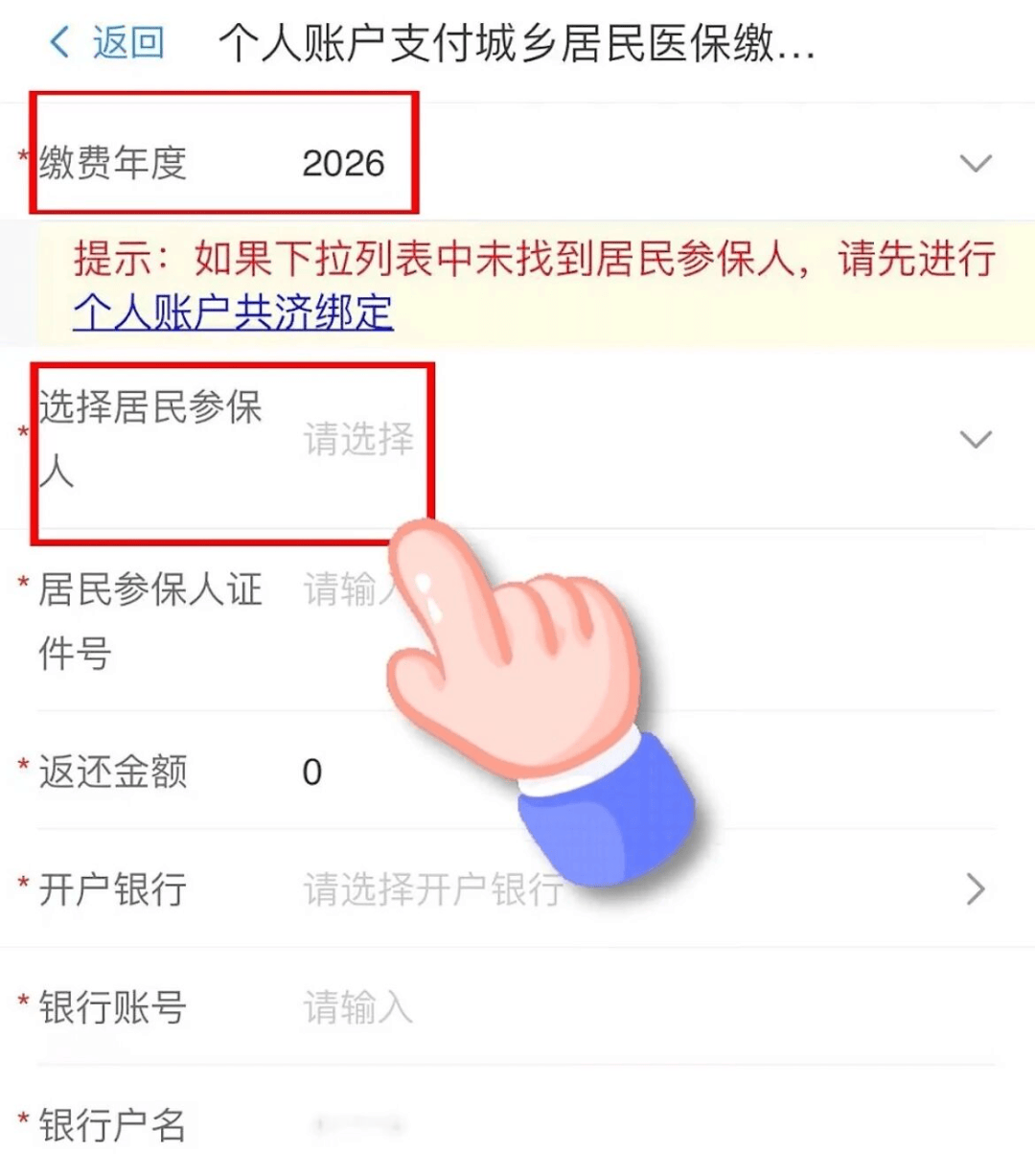 选择“缴费年度”与“城乡居民医保参保人”,完善相关个人信息,添加共济对象后,提交申请。