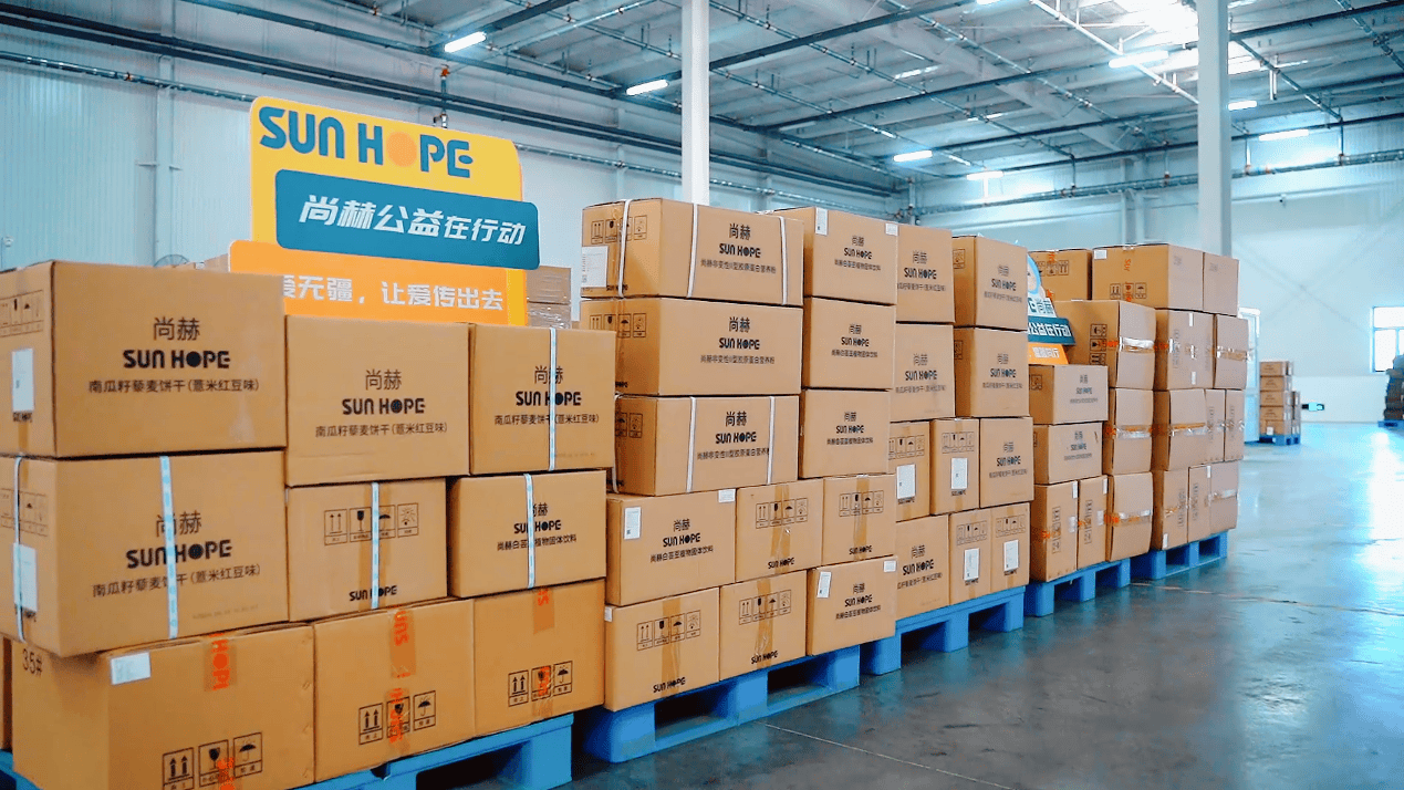 仓库内,尚赫公司的公益物资整齐排列、储备充足,为后续公益项目的落地实施提供了坚实保障